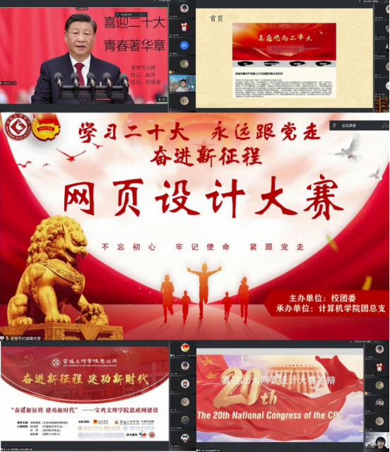 本次大学生网页(站)设计大赛由校团委主办,计算机学院团总支承办,物理与光电技术学院团总支、机械工程学院团总支、电子电气工程学院团总支、校学生会、校研究生会协办。本次大赛经过前期广泛宣传,各学院组织动员,共有近400名学生报名参加了本次大赛。经过为期两周的线上培训后,共有72件作品报名参赛。经专业老师的初评后,来自电子电气工程学院、机械工程学院、文学与新闻传播学院及计算机学院的15组选手进入了决赛。选手们紧紧围绕“学习二十大、永远跟党走、奋进新征程”这一主题,通过3D旋转相册、党的百年奋斗史视频及超链接等形式,宣传展示了党的二十大报告原文、相关新闻素材及党的二十大学习心得体会等,并以PPT现场汇报的形式介绍了产品设计理念、核心技术以及产品功能,让用户能深入学习党的二十大精神,凝聚奋进力量。