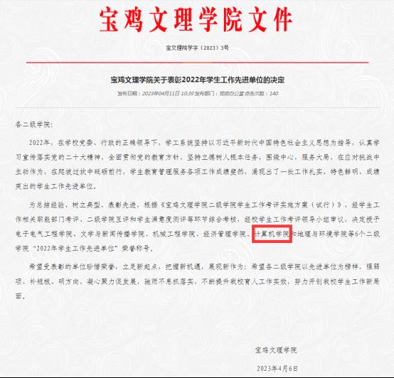 根据《宝鸡文理学院二级学院学生工作考评实施方案(实行)》及《宝鸡文理学院二级学院学生工作考评指标体系》,我院积极对学生日常教育管理服务、学生党建、宣传教育、共青团工作、服务教学、就业创业指导服务、安全稳定、教室管理等8个考评项目进行自评,学生满意度测评及学校学生工作考评会评审,最终喜获2022年学生工作先进单位荣誉称号。