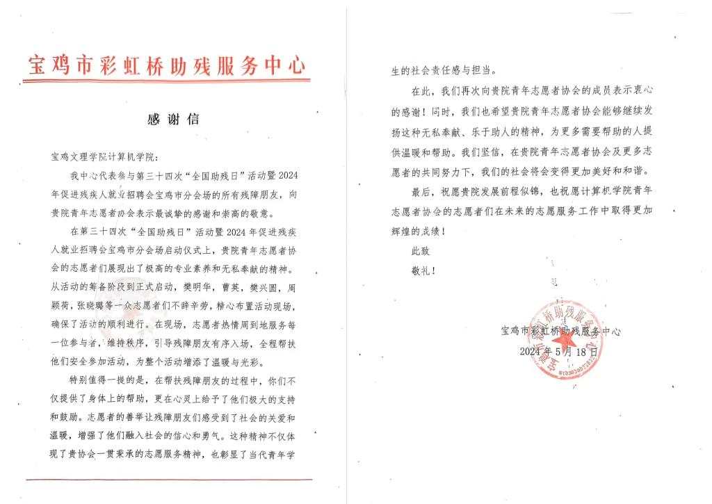 近日,宝鸡市彩虹桥助残服务中心发来感谢信,对我院青年志愿者协会樊明华、曹英、樊兴园、周颖荷、张晓璐等17名同学在5月18日第三十四次“全国助残日”活动暨2024年促进残疾人就业招聘会宝鸡市分会场启动仪式上所做的志愿服务表达感谢和敬意。