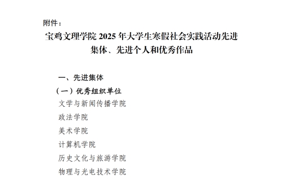 近日,共青团宝鸡文理学院委员会公布了《宝鸡文理学院2025年大学生寒假社会实践活动先进集体、先进个人和优秀作品》评选结果。计算机学院在此次评选中表现优异,荣获“优秀组织单位”称号,并有1支团队获评“优秀社会实践团队”、11名同学获评“社会实践先进个人”,同时7件作品获评“优秀社会实践作品”,充分展现了学院在社会实践工作中的卓越成效和学子的实践创新能力。