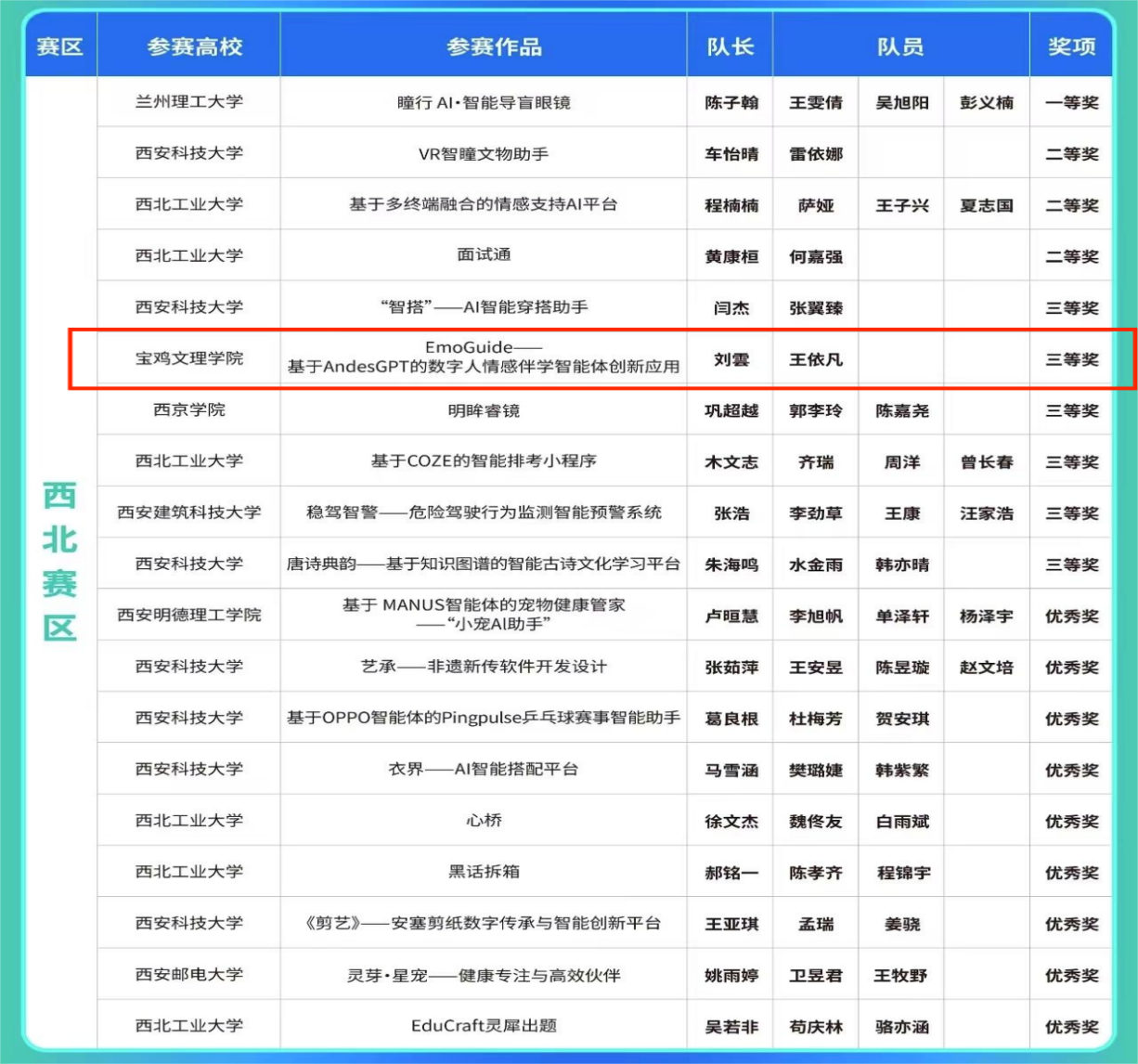 近日,第四届(2025年)“中国高校计算机大赛——智能交互创新赛”区域赛获奖名单正式揭晓。我院学生刘雲和王依凡组队参赛的项目《EmoGuide——基于AndesGPT的数字人情感伴学智能体创新应用》获西北赛区三等奖。