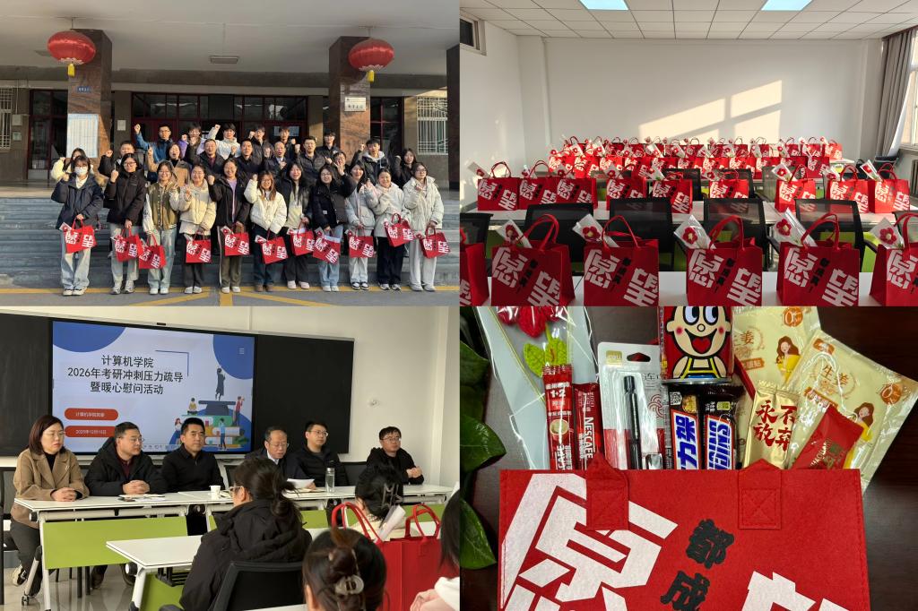 12月10日上午,计算机学院在石鼓校区主教楼509会议室举行2026年考研冲刺压力疏导暨暖心慰问活动,为即将奔赴考场的2022级学子加油鼓劲,送上学院的关怀与祝福。学院党委书记王林、院长李亚峰、党委副书记张磊、学院考研指导中心主任张平及年级辅导员参加活动,学院党委副书记张磊主持活动。