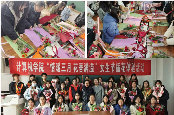 3月6日,计算机学院在主教楼504党员活动室开展了“情暖三月 花香满溢”女生节插花体验活动。学院37位幸运同学参加了此次活动,活动由团总支书记于乐主持。 活动开始前,于乐为大家送来了女生节的祝福,她讲到,每个女生都拥有属于自己的光芒,在这个特殊的日子里,愿每个女生都能感受到来自学院的暖心关爱,展现出自己与众不同的风采,在平时的学习生活中奋发向前、乘风破浪。随后,大家迫不及待的开始根据自己的喜好装饰自己的花束,挑选自己喜欢的包装纸和缎带,一束束浪漫而美好的花束应运而生。大家纷纷表示,在这个属于女生的节日里,舒缓了平日紧张而忙碌的学习压力,陶冶了情操,感受插花艺术的独特魅力。