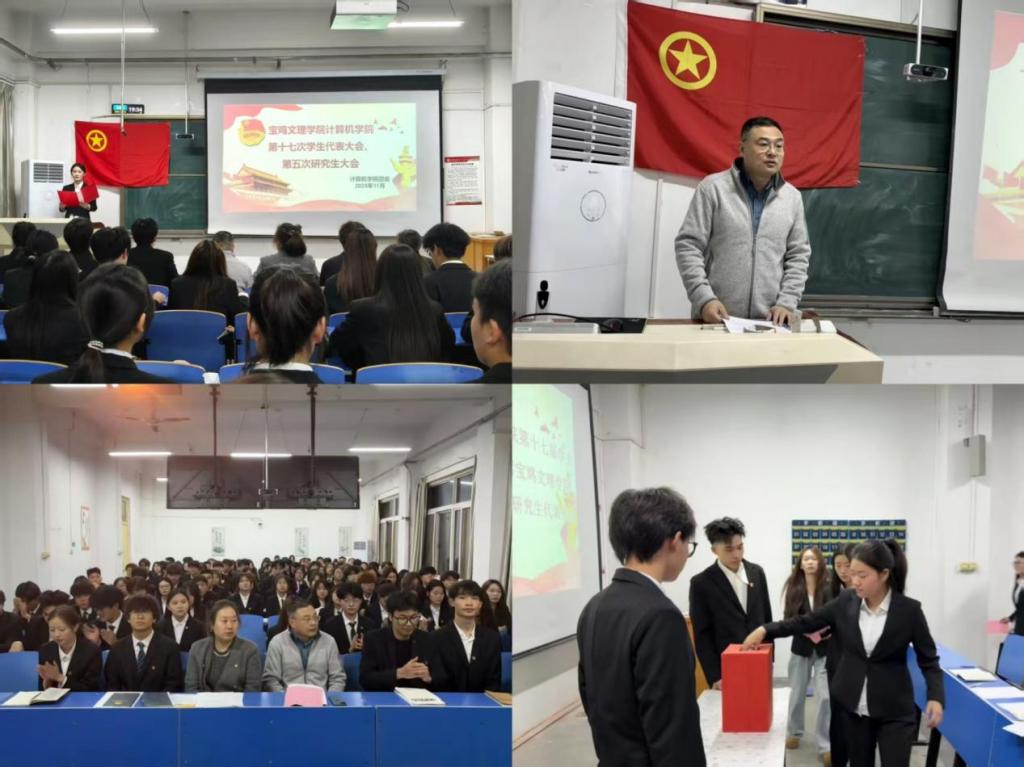 大会在庄严雄壮的国歌中拉开序幕。 张磊对学生干部提出三点要求,一是保持奋进姿态,兼顾学业与工作;二是立足点滴小事锤炼担当精神,在日常实践中积累经验,高效落实任务;三是要敢于突破、勇于探索,在实干笃行中实现成长成才。会上,李月阳对上一届学生委员会工作进行总结汇报。于乐宣读了《宝鸡文理学院计算机学院第十七次学生代表大会、第五次研究生大会代表选举办法》。按照选举办法与流程,民主选举产生了计算机学院第十七届学生委员会委员、主席团成员,以及出席宝鸡文理学院第十七次学生代表大会、第五次研究生代表大会的正式代表。大会在激昂的团歌声中圆满落幕。